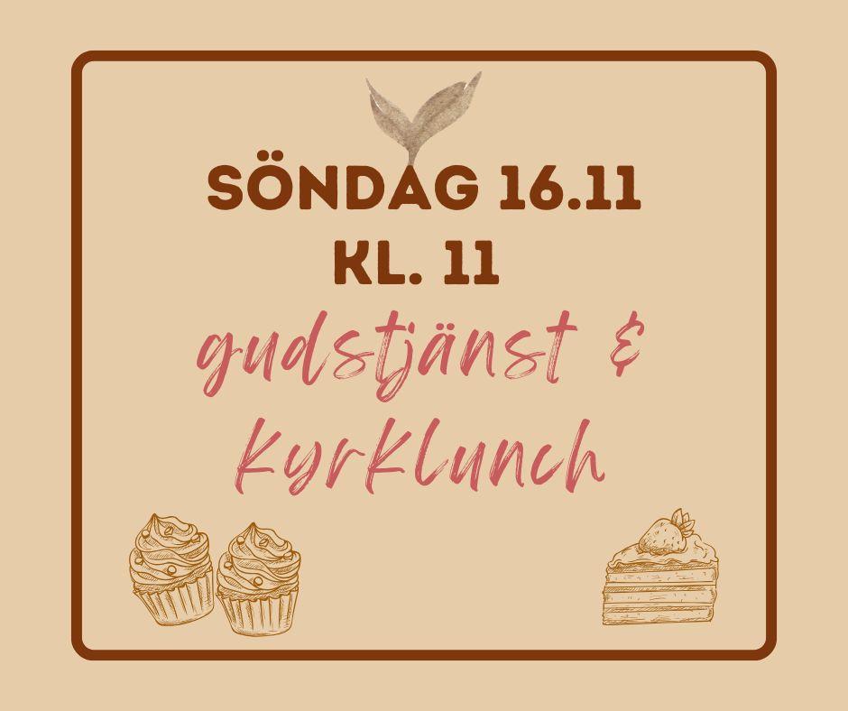 Inkommande söndag den 16.11 har vi kyrklunch efter gudstjänsten! Gudstjänsten börjar kl. 11, kyrklunchen ungefär kl. 12. På menyn står köttsoppa, kaffe och efterrätt.